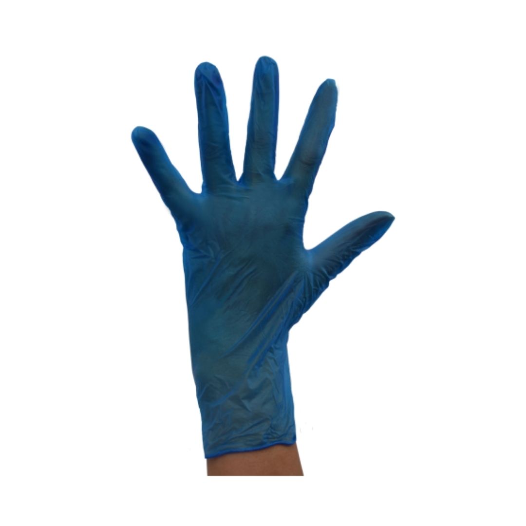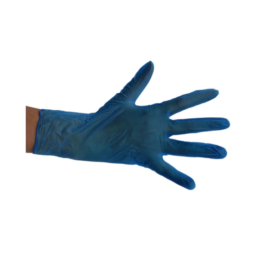 Luva descartável de vinil azul sem pó, EPI CAT III Tipo C, lisa e confortável, adequada para contacto alimentar e tarefas profissionais.