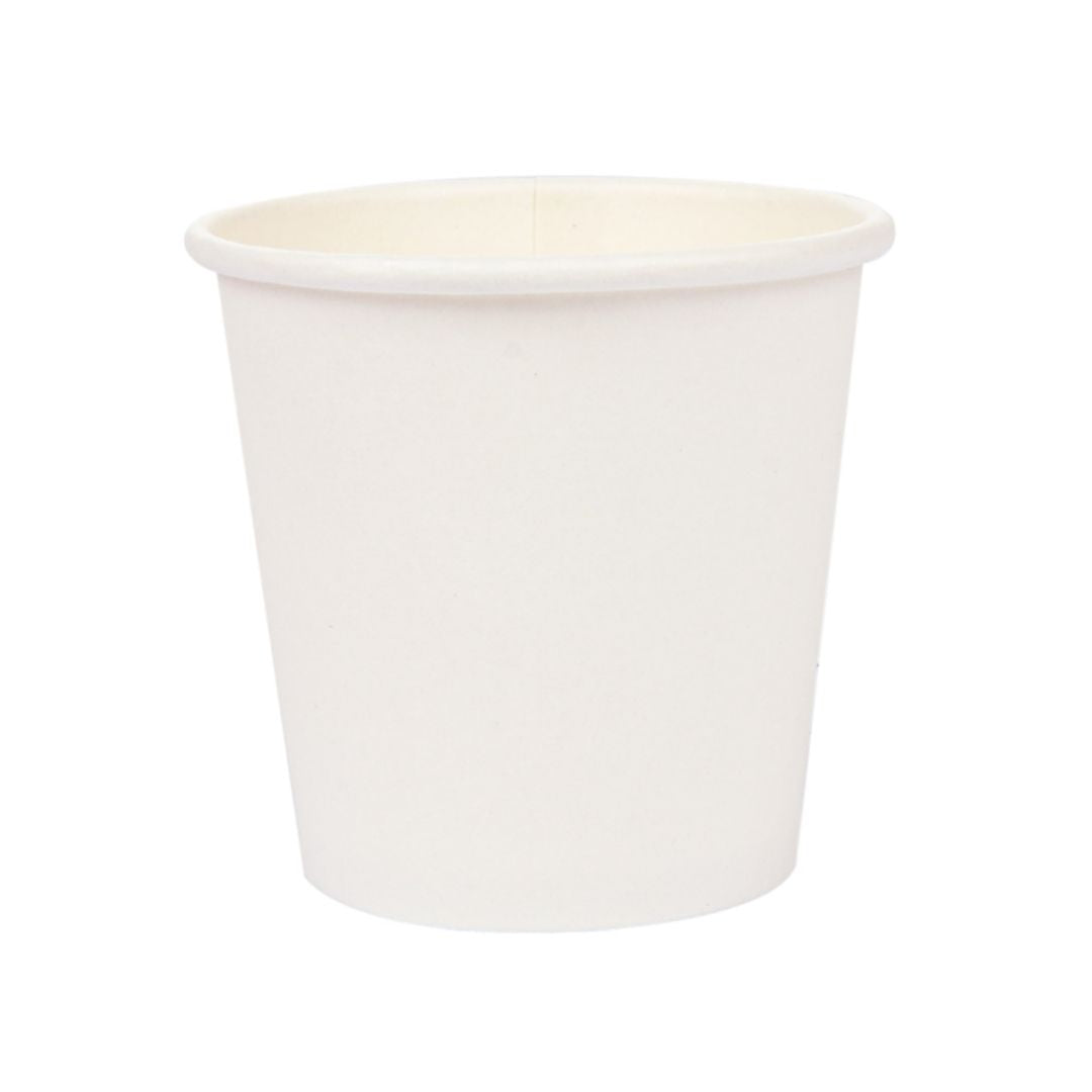 Copo de cartolina branco 55 ml, parede simples, reciclável, resistente de 15 ºC a 85 ºC, ideal para cafés espresso. Pacotes de 50 unidades.