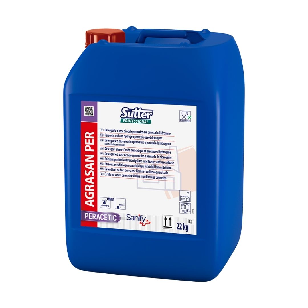 O Sutter Agrasan Per é um detergente desinfetante profissional formulado com ácido peracético e peróxido de hidrogénio, desenvolvido para garantir limpeza e higiene eficazes em ambientes com elevados requisitos sanitários. A sua formulação é especialmente indicada para o setor agroalimentar, estando totalmente alinhada com os princípios HACCP, assegurando elevados padrões de segurança microbiológica.