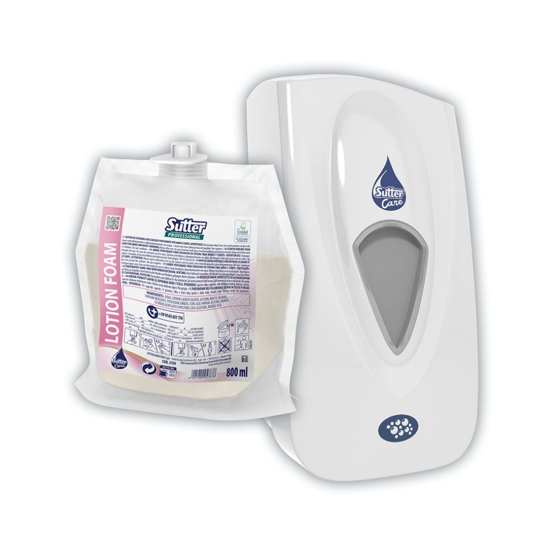 Sutter Lotion Foam está certificado com o rótulo ecológico europeu Ecolabel IT 030 010, comprovando o seu reduzido impacto ambiental ao longo do ciclo de vida. É fornecido em bolsa de 800 ml com sistema Captive, permitindo mais de 1300 doses e garantindo uma dosagem controlada e económica quando utilizado com o dispensador Sutter Care Foam Hygiene.