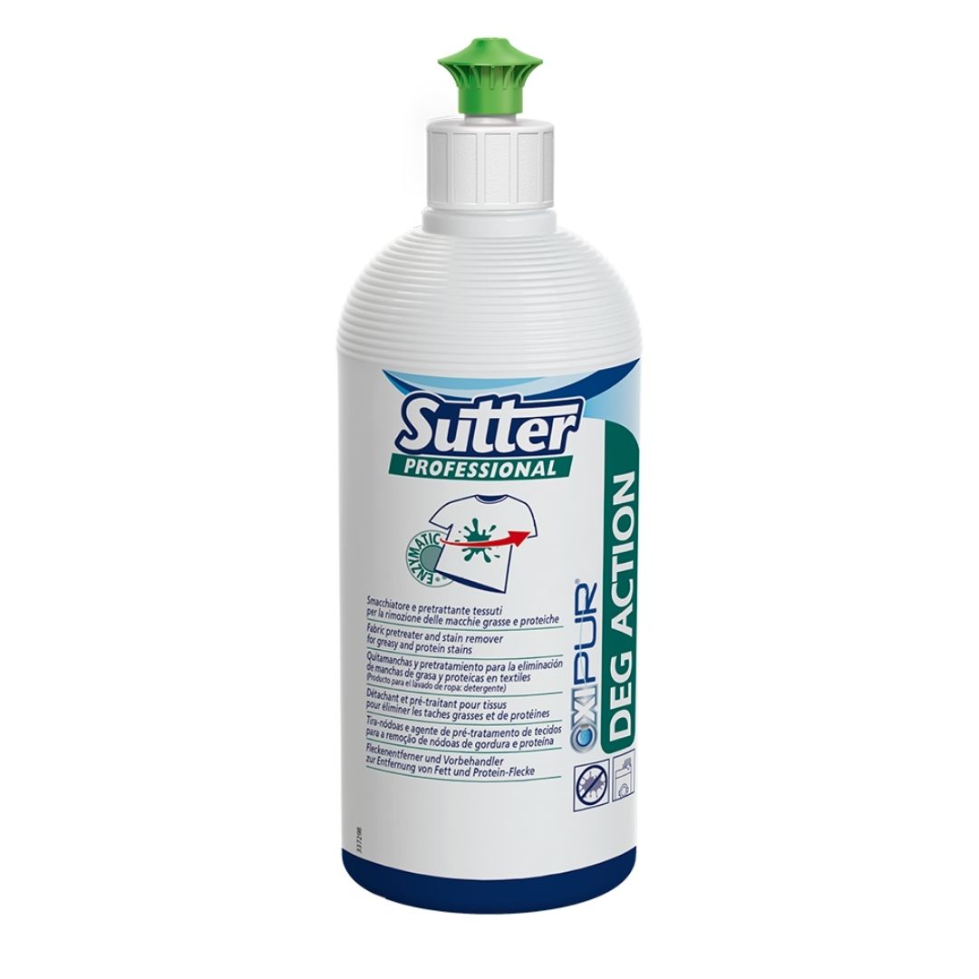 O Sutter Deg Action é um tira nódoas profissional e agente de pré tratamento de tecidos, desenvolvido para a remoção eficaz de nódoas de gordura e proteína que dificilmente são eliminadas apenas com a lavagem mecânica. Atua de forma específica sobre gorduras de origem animal, como banha, origem vegetal, como óleos alimentares, e origem mineral, como óleo de motor, bem como sobre manchas proteicas comuns em contextos profissionais.
