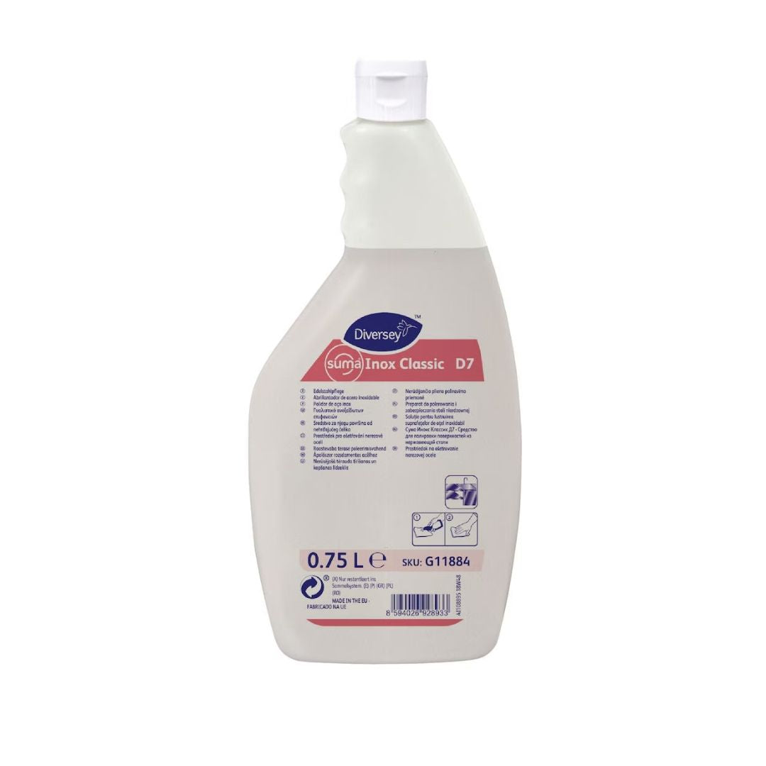 O Diversey Suma Inox Classic D7 é um produto pronto a usar desenvolvido para o polimento profissional de superfícies em aço inoxidável que não estejam em contacto direto com alimentos. A sua fórmula foi especialmente concebida para restaurar o brilho natural do inox, removendo facilmente marcas de dedos, manchas de água e sujidade ligeira acumulada no quotidiano. A mistura equilibrada de óleos e solventes proporciona uma ação de limpeza eficiente e um acabamento uniforme, deixando um brilho suave e duradouro que melhora o aspeto visual dos equipamentos.