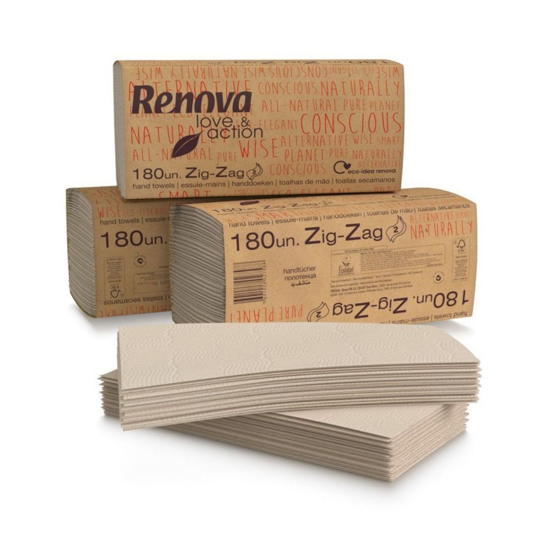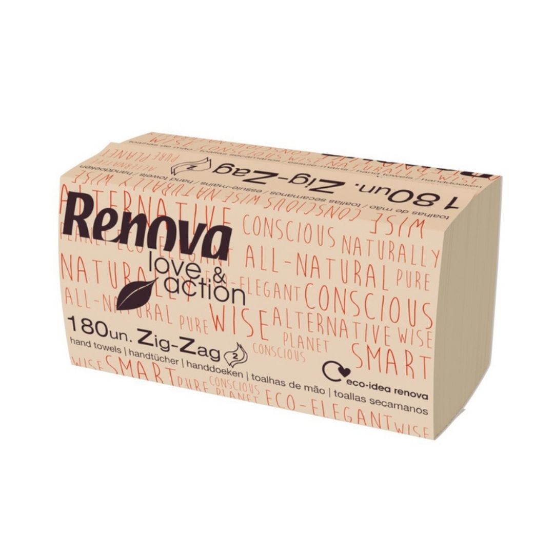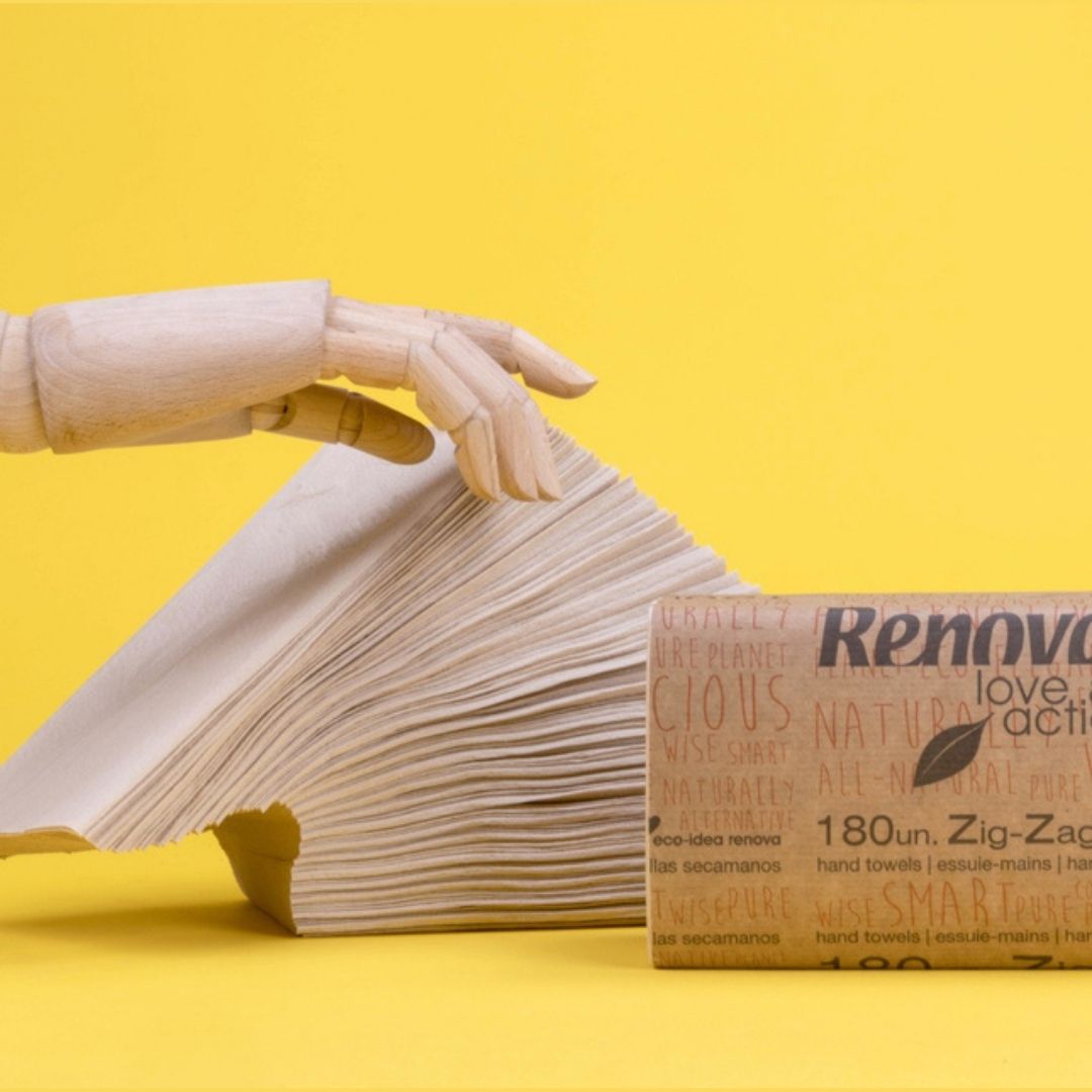 Estas toalhas de mão zig zag Renova Love & Action são produzidas em papel cru natural, num tom bege suave obtido a partir da reciclagem de papéis já utilizados. A composição em fibras recicladas garante um produto sustentável, mantendo simultaneamente resistência, boa absorção e conforto ao toque. O produto é certificado com o Rótulo Ecológico da União Europeia e com a certificação FSC®, assegurando que o material celulósico de base florestal utilizado provém de fontes geridas de forma responsável.
